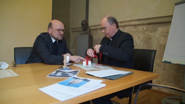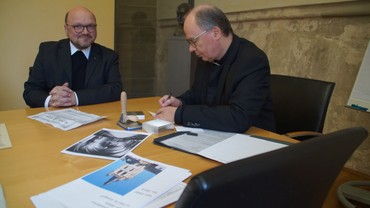 Eine kleine Delegation der Pfarrei mit Mitgliedern des Verwaltungsrates, des Pfarrgemeinderates, der Küsterfamilie und des Pastors war am 27. März in den Bischofshof eingeladen, um der Versiegelung des Reliquiars durch Bischof Stephan beizuwohnen. In die Pyxis wurde die Reliquie, eine Kopie der alten Echtheitsurkunde von Bischof Korum und eine auf Ziegenleder-Pergament in lateinischer Sprache verfasste neue Urkunde von Bischof Dr. Stephan Ackermann eingelegt.