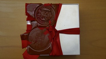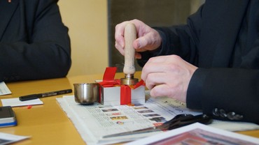 Anschließend wurde die Pyxis verschlossen und mit einem roten Band umwickelt. Auf dieses wurde flüssiger Siegellack gegossen und zunächst mit dem Siegel des Bischofs und dann mit dem Siegel der alten Pfarrei St. Gangolf gesiegelt. Zum Abschluss der kleinen Feierstunden beteten die Anwesenden gemeinsam die Litanei der Trierer Heiligen, der Bischof sprach ein Segensgebet.