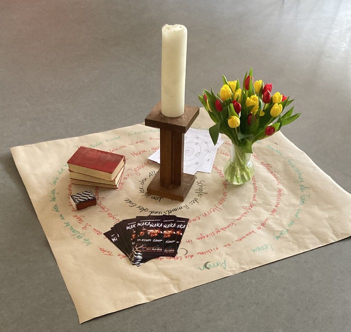 Das ist eine "gestaltete Mitte". Fast schon ein Klischee von Gemeindepädagogik. Aber auf diesem Bild sind doch einige Dinge drauf, ohne die mein Arbeitsleben nicht möglich wäre: eine Bibel, das Glaubensbekenntnis zum Mitlesen und Drübernachdenken, Einladungen zum KonfiCamp ... Es fehlt eigentlich nur etwas zum Essen oder zum Trinken. Um diese Mitte herum sitze ich dann mit Jugendlichen, und wir beginnen oder beenden einen von vielen spannenden Tagen in der Jugendarbeit.