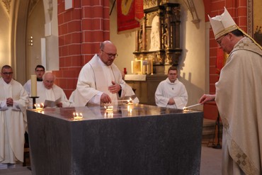 Höhepunkt war natürlich die Altarweihe, ein doch selten gewordenes Ereignis mit opulentem Ritus. Feierliche Stille erfüllte den Raum, als die Beisetzung der kleinen Reliquie von St. Gangolf erfolgte. Anschließend salbte unser Bischof den neuen Altar und entzündete an fünf mit Kreuzen markierten Stellen Feuer zum Verbrennen des in die Höhe aufsteigenden Weihrauchs. Ein berührendes symbolhaftes Bild.