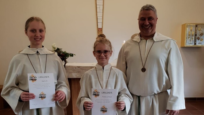 Am Sonntag war es dann endlich so weit; alle Vorbereitung in der Stille wurde nun der Gemeindeöffentlichkeit sichtbar. In einer seiner allerletzten Amtshandlungen für St. Cäcilia durfte Pfarrer Karlson noch einmal Freude verbreiten und die Beiden in ihre neuen Aufgaben einführen: Friederike beginnt nun ihren Dienst am Altar, Bega übernimmt die Aufgaben einer Oberministrantin. Herzlich willkommen und ein großes Vergelt‘s Gott für euer Engagement in unserer Gemeinde St. Cäcilia. Möge Gottes guter Segen Eure Schritte begleiten.