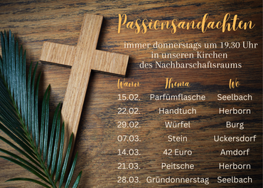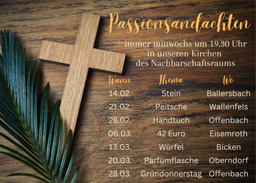 In diesem Jahr machen wir uns im Nachbarschaftsraum gemeinsam auf den Weg Richtung Ostern. Mit sechs Passionsandachten, welche von den sechs Pfarrpersonen im Nachbarschaftsraum gestaltet werden, wollen wir uns diesem Ereigniss annähern, welches zentral in der Mitte der christlichen Botschaft steht.