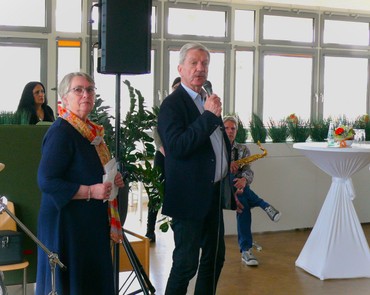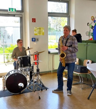 Musikalisch untermalt wurden die Feierlichkeiten von dem bekannten Künstlerehepaar Megi und Frank Balzer. Megi Balzer ist selbst aktive Helferin bei der Tafel und spielt in dem Duo Schlagzeug, ihr Mann Frank Balzer das Saxophon. Mit ihrer jazzorientierten Weltmusik, die so perfekt zu der Gesamtatmosphäre der Veranstaltung passte, zauberten sie sphärische Klänge in den Saal, denen die Gäste andächtig lauschten.
