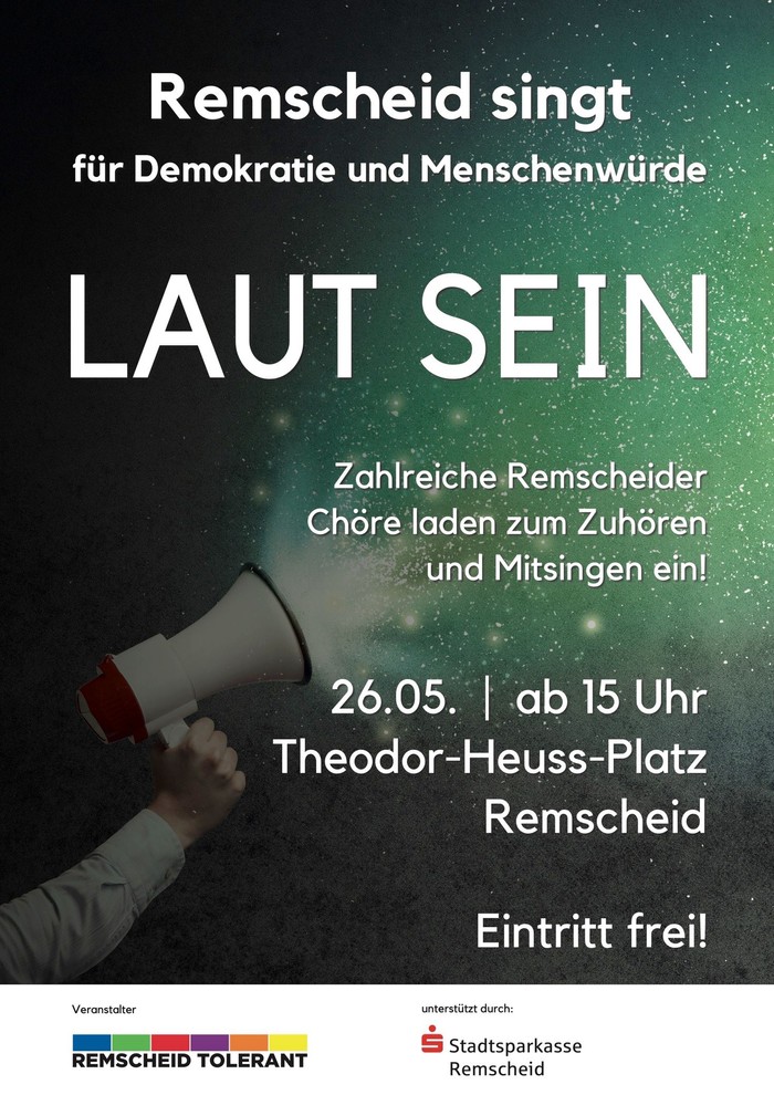 Am Sonntag, den 26. Mai 2024 findet um 15:00 Uhr ein großes Mitsingkonzert auf dem Rathausplatz in Remscheid statt.