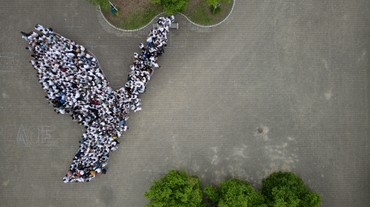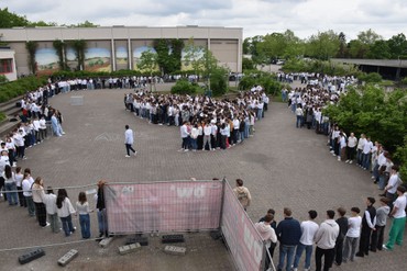 Sie bildete den Ausschnitt, in den sich SchülerInnen und Lehrkräfte versammelten. - Anschließend lud Aaron zu einer Gedenkminute ein. - Für das Foto von oben stellten sich die vielen, die keinen Platz in der Taube gefunden hatten, zu einem eindrücklichen „Bilderrahmen“ um sie herum. - Ein kurzer Poetry-Text von Pfarrer Würfel rundete die gemeinsame Aktion ab. Auch hierbei wurde deutlich: Frieden kann bereits im Kleinen beginnen – und umso wichtiger ist es, sich jeden Tag für Frieden einzusetzen. Und an Frieden zu glauben. Von einer „sehr gelungenen Aktion, die das Bewusstsein hoffentlich schärft“, sprachen im Nachgang die Schulleitungen beider Schulen. (Pr, Wu)