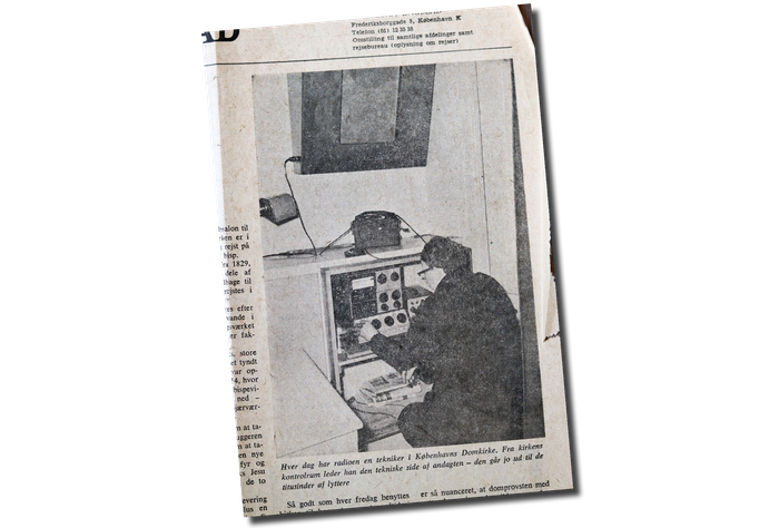 Foto fra artikel af Mogens Poulsen i Kristeligt Dagblad den 11. marts 1967, der bl.a. omhandler morgenandagten. Billedet er fra det daværende kontrolrum i Vor Frue Kirke, hvorfra en teknikker hver dag sørgede for den tekniske del af andagten.