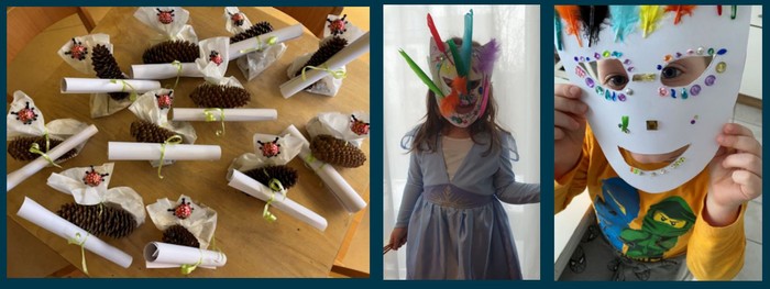 Einmal konnten die Kinder sich die Überraschung sogar selbst aus der Kita abholen: Eine Faschingsmaske zum Selbstmachen. Und auch in der Kita selbst ist einiges los gewesen: Wir haben mit den Kindern viel gebastelt, z.B. ein Vogelhaus aus Papier oder auch etwas Schönes gemalt, wie z.B. lustige Eisbärmotive auf Papier oder Schneemänner an den Fenstern. Und letzteres nicht nur an den Scheiben. Als übers Wochenende ganz viel Schnee gefallen war, konnten wir sogar echte Schneemänner bauen. Und gerodelt sind wir natürlich auch. Das war ein Riesen-Spaß, nicht nur für die Kinder!