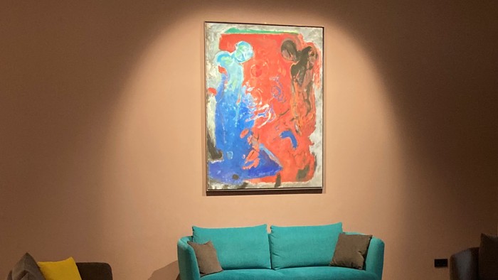 „Begegnungen“ ist der Titel des großformatigen Werkes von Thomas Richter, das Dorothea Zitzlaff-Schmidt am 12. Sonntag nach Trinitatis 2021 nach dem 11 Uhr Gottesdienst in der Lounge im I. OG dem gerade noch im Amt befindlichen geschäftsführenden Pfarrer Florian Kunz vorstellte.