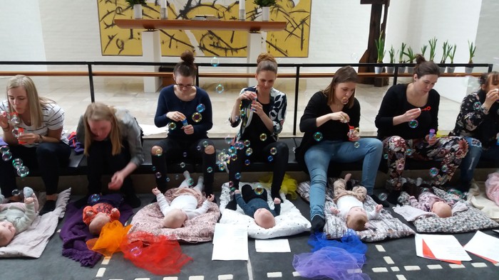 De ca. 40 minutter går med sange og salmer. Vi ser på sæbebobler, danser og gynger i tæpper m. m., så børnenes sanser bliver stimuleret på mange forskellige måder. Efterfølgende er der kaffe og brød til dem, der har tid og lyst.