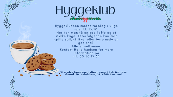 Hyggeklubben mødes torsdag i ulige uger kl. 13.30.