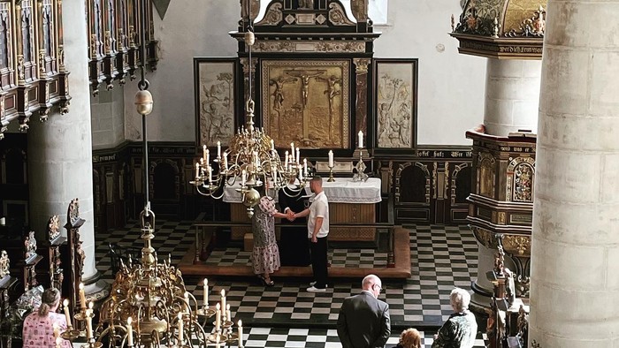 Hvert brudepar må medbringe 15 gæster til vielsen og efter vielsen bydes der på et glas bobler. Er man interesseret i at sige ’ja’ til hinanden denne dag, skal man kontakte kordegnen ved Sct. Mariæ Kirke for at reservere en af de ledige tider, der fordeles efter først til mølle-princip. 👉 mail: sktmariae.sogn@km.dk med oplysning af navn, adresse og telefonnummer.
