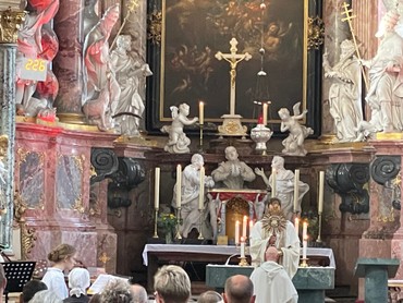 Alle versammelten sich nach und nach um die Altarinsel. Auf Knien oder stehend wurde jeder durch Pater Kilian gesegnet. Gleichzeitig legten Schwester Dolorosa und Pater Isaak die Hände auf. Ein sehr beeindruckender Moment.....