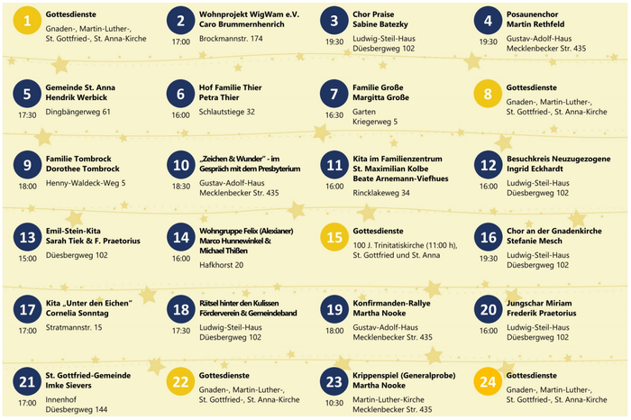 Große und kleine Leute sind herzlich eingeladen, in der Adventszeit innezuhalten und sich an verschiedenen Stellen im Gemeindegebiet zu versammeln, um für ca. 20 Minuten Musik und Geschichten zu hören und zu singen. Sie geben uns eine Ahnung, dass Gott ganz nah ist. Willkommen zu einem ökumenischen Projekt der Ev. Johannesgemeinde, der Kath. St. Gottfried- und der St. Anna-Gemeinde.