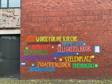 Die Konfis aus Mecklenbeck haben NEUE WORTE FÜR DIE KIRCHE erfunden und sie am Reformationstag an die Kirche geklebt. Schon bei den Klebearbeiten guckten manche etwas verwundert rüber und fragten sich wohl, was da an der Kirche los ist.