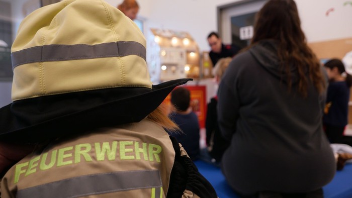 Rund um den Feuerwehrwagen, oder genauer: den Löschgruppenzug, hatte sich schon eine Traube von Mädchen und Jungen gebildet. Zusammen konnten sie aufsatteln und erleben, wie die Feuerwehr zum Einsatz fährt. Das Atemschutzgerät wurde vorgeführt, und die kleinen Entdecker durften einen Teil der Schutzausrüstung anprobieren. Selbst die kleinen Größen der Jugendfeuerwehr waren für die Kitajahrgänge noch zu groß, und die Kindergartenkinder verschwanden völlig unter Helm und Einsatzmantel.
