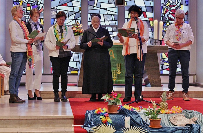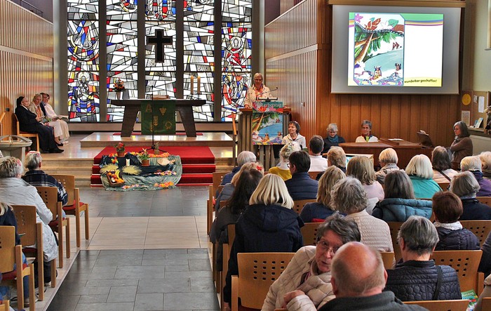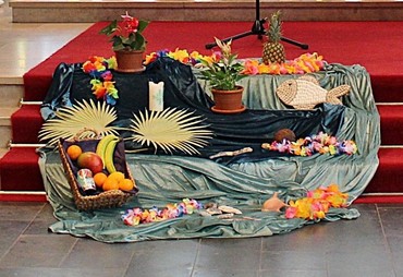 Mit exotischen Früchten, Blütenketten, Palmblättern und bunten Stoffen waren die Stufen zum Altarraum geschmückt. Das Plakat zum Weltgebetstag zierte als Antependium die Kanzel und per Beamer als Willkommensgruß die große Leinwand, die im Gottesdienst immer wieder zur Liedertafel wurde. Ein bildhaftes Zeugnis der Südsee mit Meer, Weite, maorischen Traditionen und Frauen als ihre Botschafterinnen.