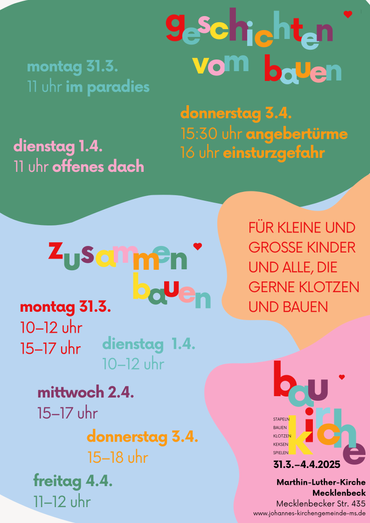 Alle Angeberturmbauer und Steinestapler aufgepasst: In der Martin-Luther-Kirche ist bald Baustelle. Ev. Johannes-Kirchengemeinde hat 27 Kisten Duplo und jede Menge Bauplatz. Es gibt Zeiten, bei denen Geschichten vom Bauen erzählt werden, und Zeiten, um zusammen zu bauen. Vom 31.3. bis 4.4. ist die Baukirche geöffnet. Die genauen Zeiten finden Sie auf dem Flyer.