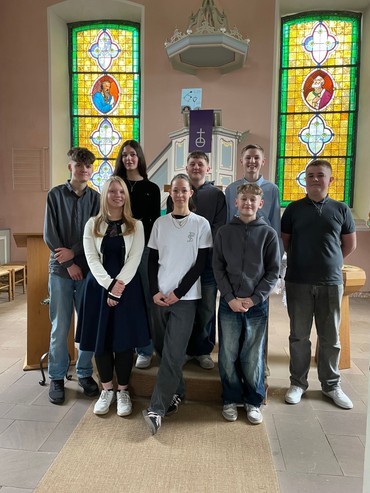 Die Konfis glücklich und zufrieden nach ihrem Vorstellungsgottesdienst. Von links nach rechts: Marlon Berthel, Eyleen Gräfe, Fenna Meyfarth, Elea Heimel, Jonas Wolafka, Julian Wolafka, Phil Fischer und Leon Sauermann)