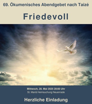 am 28.05.2025 um 20:00 Uhr laden die Evangelische und Katholische Gemeinde in Neuenrade wieder gemeinsam zum monatlichen ABENDGEBET NACH TAIZE´ein. Diesmal in der Katholischen Kirche.