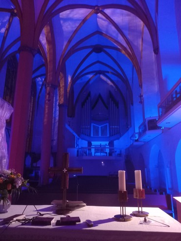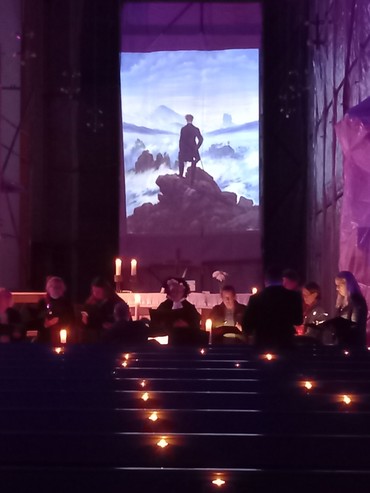 Die beiden Pfarrer Wolfram Köhler und Thomas Schrader - und mit ihnen viele Akteure aus dem Kirchenvorstand und der Gemeinde trugen Gedichte und Texte von Tieck, Brentano, Bettine von Arnim, Novalis und Schleichermacher vor. Zusammen mit historischen Einblicken in die Zeit entstand ein kurzweiliges und vielfältiges Gemälde der zweiten Gründerzeit unserer Evangelischen Gemeinde vor 200 Jahren. Alle frisch-, alt- oder halb verliebten Paare konnten eine Kunstkarte mit Gemälden aus der Romantik beschriften. Mit einem kleinen Imbiss, Getränken, lebendigen Austausch und einer roten Rose am Ausgang endete die "Romantische Nacht" gegen 0.30 Uhr