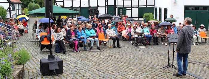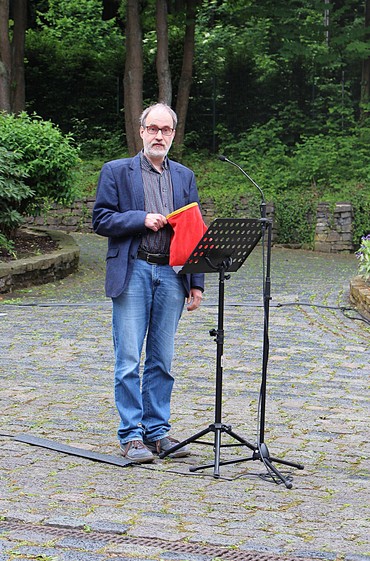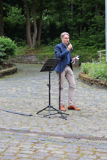 Die Evangelische Allianz Iserlohn & Hemer hatte wie in den vergangenen Jahren in die historische Fabrikanlage Maste-Barendorf in Iserlohn eingeladen. „Ich weiß es noch genau. Im letzten Jahr hatte ich hier an dieser Stelle bei meiner Begrüßung eine Sonnenbrille auf“, erinnerte sich Dr. Thomas Knöppel und freute sich über die dennoch rege Teilnahme. Gut 160 Menschen hatten sich trotz Wetterlage ein Herz gefasst und sich aufgemacht, um aus den unterschiedlichen christlichen Gemeinden der Region die Himmelfahrt Jesu miteinander zu feiern. In der Gemeinschaft mit ihm sollte dieser Vormittag zum „Fest der Ermutigung und des Glaubens an den Herrn und Heiland Jesus Christus, trotz kriegerischer und katastrophaler Bedrohungen in der Welt“, werden, so Dr. Thomas Knöppel.
