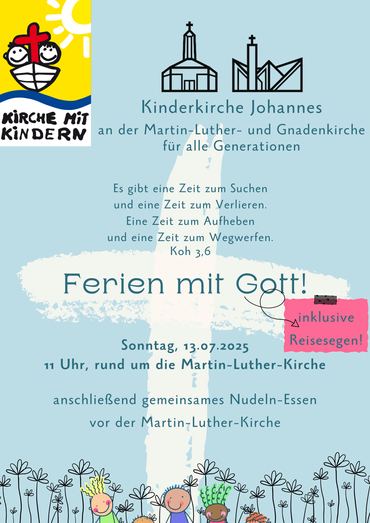 Wer noch nicht verreist ist, kann am kommenden Sonntag, 13.07., um 11 Uhr in der Martin-Luther-Kirche noch die Kinderkirche für alle Generationen miterleben – inklusive Reisesegen für den Urlaub.