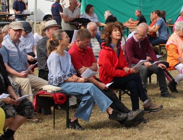 Spätestens nach dem aus vollen Kehlen gesungenen und vom Posaunenchor intonierten Lied „Lobet den Herren“ sind alle auf dem Gelände informiert und lauschen dem Reisepsalm über die Begleitung Gottes, dem „Schirmherrn meiner Lebensreise“, den Gudrun Adler gemeinsam mit Pfr. Neuser und der Gemeinde lesen.