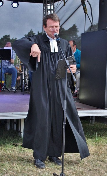 Ein Gottesdienst auf diesem Treffen scheint wie ein Fremdkörper und doch findet er schon das dritte Mal hier statt. Inzwischen ist er eine Tradition. Pfr. Bernd Neuser wirbt über die Lautsprecher und lädt die Besucher auf dem Campingplatz und an den Frühstückstischen ein hinzuzukommen.