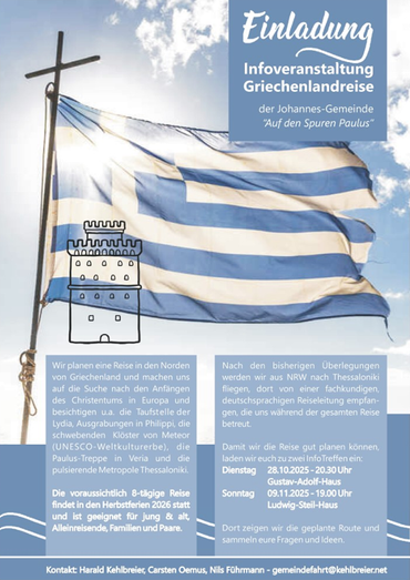 Herzliche Einladung zu einem Informationsabend für die Gemeindereise nach Griechenland (Herbst 2026) am 28.10. um 20:30 Uhr im Gustav-Adolf-Haus oder am 09.11. um 19:00 Uhr im Ludwig-Steil-Haus.