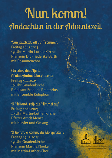 In diesem Jahr lädt die Johannes-Kirchengemeinde herzlich zu unseren Adventsandachten ein. An jedem Freitagabend vor dem kommenden Adventssonntag um jeweils 19 Uhr nehmen wir uns Zeit, um zur Ruhe zu kommen, Kerzen zu entzünden und uns gemeinsam auf den Advent einzustimmen.