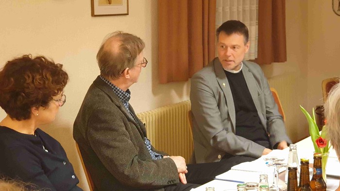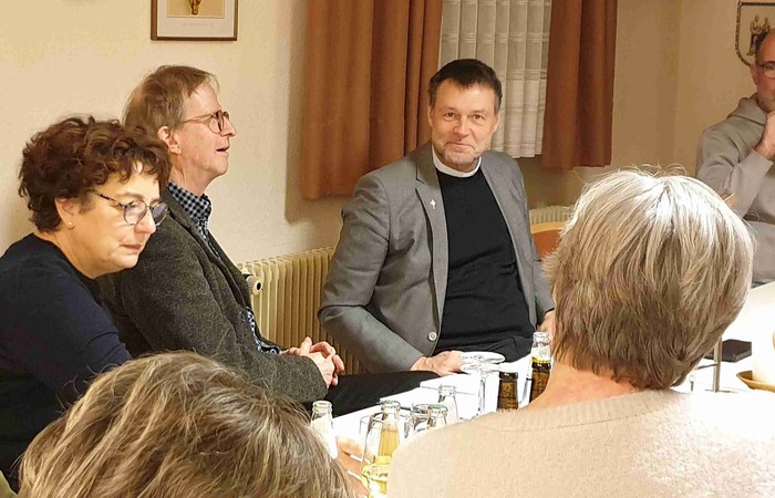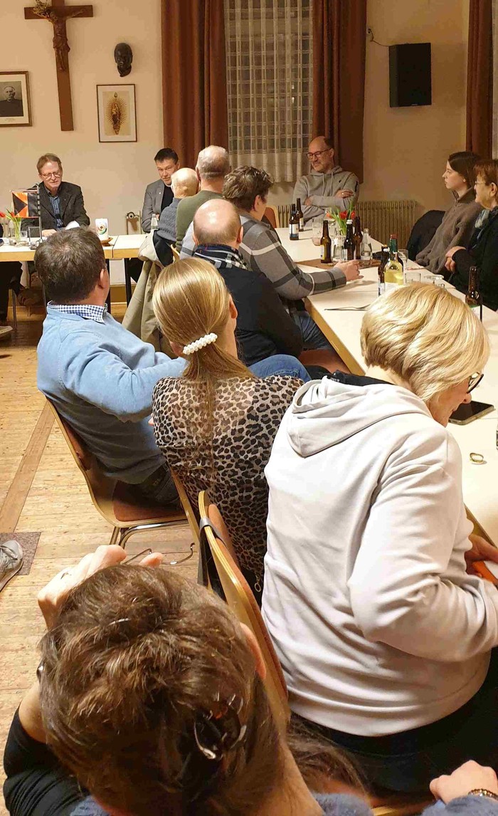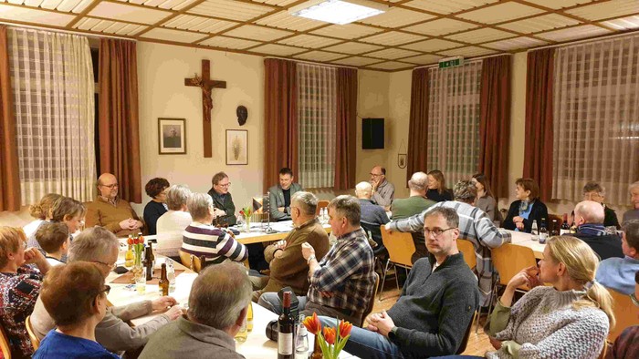 Alle Stühle waren besetzt im Kolpinghaus, wo es nach dem Gottesdienst und einem deftigen Abendessen um die zukünftigen Weichenstellungen für christliches Leben in unseren Gemeinden ging. Josef Richter vom Kolping-Organisationsteam leitete das Gespräch mit einer Reihe persönlicher Kennenlernfragen an Pfarrer Günther ein, der erst seit gut einem Jahr im hessischen Kegelspiel tätig ist. Dass Markus Günther Bergsteigen liebt, wussten einige schon. „Gibt es etwas beim Bergsteigen, das Sie auch auf den priesterlichen Dienst anwenden können?“, fragte Josef Richter. Es gehe bei beidem viel um Ausdauer, um die Fähigkeit zur besseren Anpassung an unterschiedliche Bedingungen und darum, Dinge mit einer gewissen Distanz „von oben“ zu betrachten, erklärte Günther.