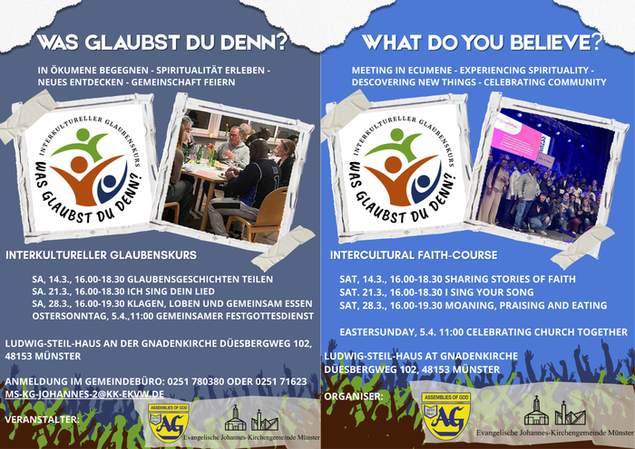 The course is aimed at adult Christians who are interested in ecumenical encounters and interdenominational exchange. The focus is on meeting people from different Christian traditions – both from their own congregation and from the international Assemblies of God congregation.