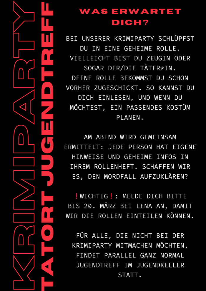Für alle, die nicht bei der Krimiparty mitmachen möchten, findet parallel ganz normal Jugendtreff im Jugendkeller statt.
