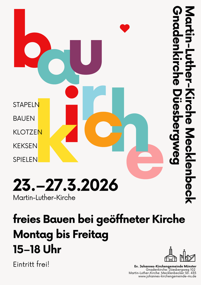 In der Martin-Luther-Kirche kann in der Woche vom 23. März bis zum 27. März jeden Tag von 15 bis 18 Uhr gebaut werden. Außerdem gibt es am Montag, 23. März, die Möglichkeit von 10 bis 12 Uhr zu bauen.