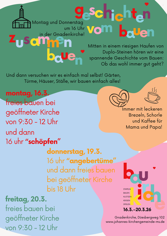 Am Montag und am Donnerstag gibt es um 16 Uhr außerdem noch Angebote für die Kleinsten - wir hören eine Geschichte aus der Bibel, fragen uns, was das auch heute noch mit uns zutun hat und machen uns an die Steine. Wie kann man eine Geschichte aus der Bibel mit Duplo-Steinen nachbauen?