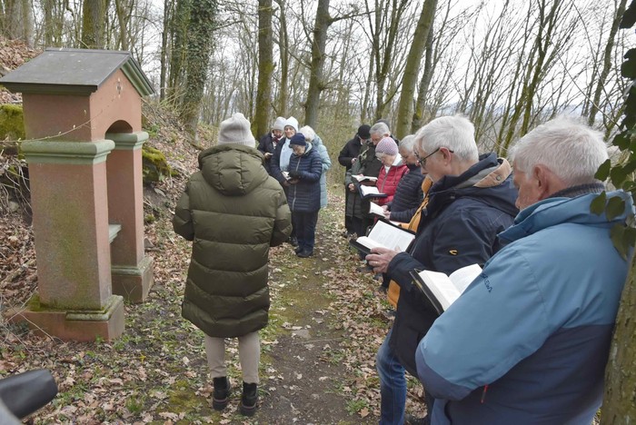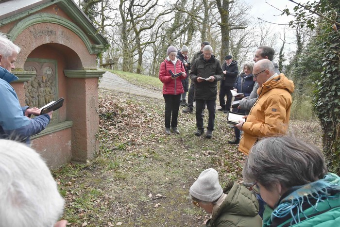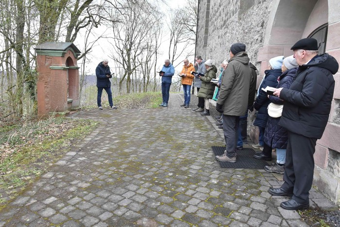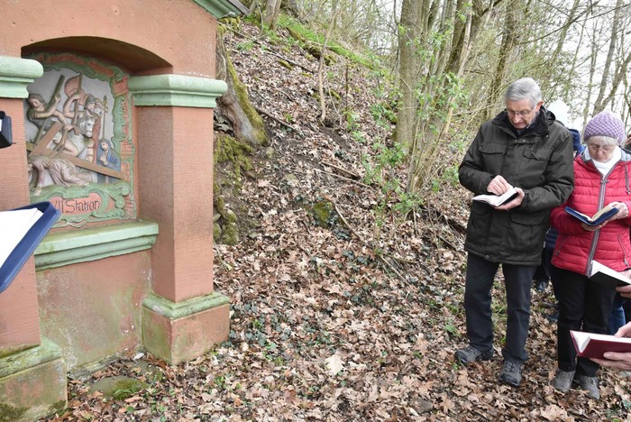 Schon seit sehr vielen Jahren wird die Tradition des Kreuzwegs am Nachmittag des Palmsonntags auf dem Gehilfersberg gepflegt. Auch in diesem Jahr waren wieder Gläubige auf den Berg gekommen, um singend und betend den Leidensweg Jesu nachzugehen. Die Stationen 1-11 sind rund um den Berggipfel angeordnet und tangieren den Friedhofswald Gehilfersberg. Die Station 12 ist gegenüber der Seiteneingangstür der Wallfahrtskirche, die Station 13 gegenüber auf der Rasdorf zugewandten Seite und die 14. Station unter der Vorhalle zum Haupteingang. Die Gebetstexte der Stationen wurden durch Lieder ergänzt.