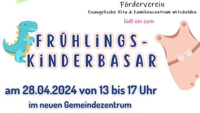 Der Förderverein ev. Kita & Familienzentrum Witzhelden lädt zum Frühlings-Kinderbasar. Tischanmietung per Mail info@villa-kunterbunt-fv.de bis 15.4.24 // Kosten: 10,- € pro Tisch zzgl. Gebäckspende.