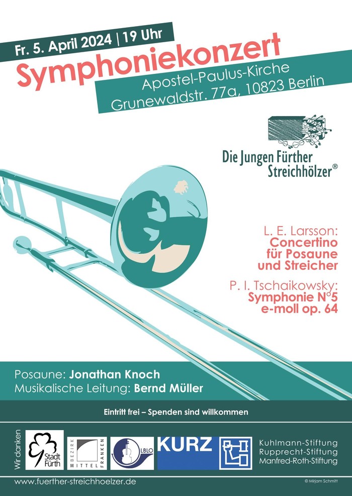 Freitag, 5. April 2024, 19:00 Uhr Apostel-Paulus-Kirche Schöneberg, Grunewaldstraße 77 A, 10823 Berlin Jonathan Knoch (Posaune), Sinfonieorchester "Die Jungen Fürther Streichhölzer", Leitung: Bernd Müller Eintritt frei - Spenden sind willkommen L. E. Larsson: Concertino für Posaune und Streicher;