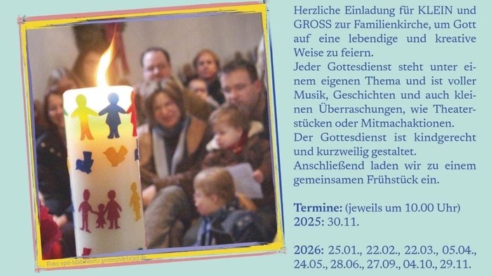 Herzliche Einladung für KLEIN und GROSS zur Familienkirche, um Gott auf eine lebendige und kreative Weise zu feiern. Jeder Gottesdienst steht unter einem eigenen Thema und ist voller Musik, Geschichten und auch klei-nen Überraschungen, wie Theaterstücken oder Mitmachaktionen. Der Gottesdienst ist kindgerecht und kurzweilig gestaltet.