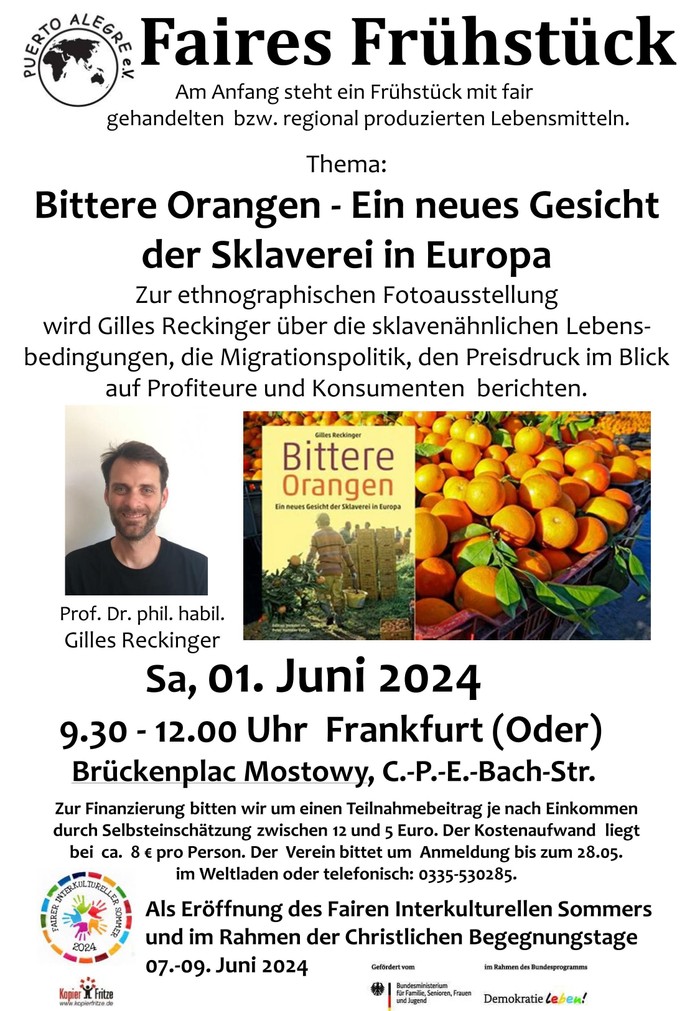 Im Anschluss wird Prof. Dr. phil. habil. Gilles Reckinger aus Graz zum Thema: „Bittere Orangen - ein neues Gesicht der Sklaverei in Europa“ über die sklavenähnlichen Lebensbedingungen, die Migrationspolitik und den Preisdruck im Blick auf Profiteure und Konsumenten berichten. Zum Thema ist vor Ort seine ethnographische Fotoausstellung, die Teil des Programms der Christlichen Begegnungstage ist, noch bis zum 9. Juni im Brückenplac Mostowy (ehem. Turnhalle) zu sehen.