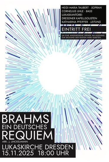 Die Lukaskantorei musiziert gemeinsam mit den Dresdner Kapellsolisten das berühmte Brahmsrequiem. Es singen Heidi Maria Taubert (Sopran) und Cornelius Uhle (Bass). Die Leitung hat Katharina Pfeiffer.