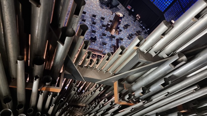 Organistinnen und Organisten aus dem In- und Ausland schätzen die vielseitigen, inzwischen auch digital erweiterten Klangmöglichkeiten dieses Instruments und lassen sich gerne zu uns einladen, wie etwa zum Internationalen Orgelsommer und zu unseren Orgelvespern am Samstag um 18 Uhr. Der Architekt Egon Eiermann war auch an der äußeren Gestaltung der Orgel beteiligt, die mit ihrer zurückhaltenden Eleganz nicht nur durch ihren Klang eine ganz besondere Präsenz in unserer Kirche hat.