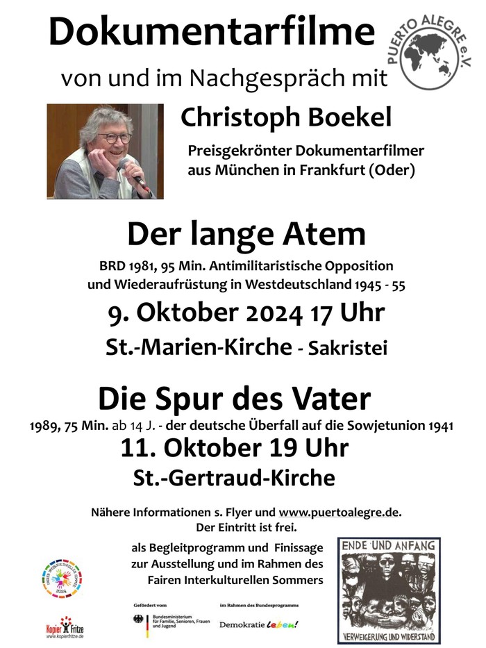 Der Dokumentarfilmer Christoph Boekel aus München zeigt im Rahmen und als Finissage der Ausstellung in der St.-Marien-Kirche „Ende und Anfang – Verweigerung und Widerstand“ zwei seiner preisgekrönten Dokumentarfilme: Am Mittwoch, dem 9. Oktober um 17.00 Uhr in der Sakristei der Marienkirche den Film: Der lange Atem – antimilitaristische Opposition und Wiederaufrüstung in Westdeutschland 1945-55.