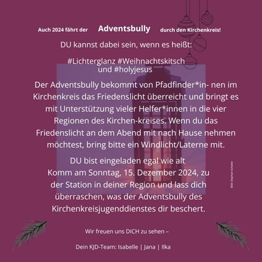 Der Adventsbulli des Kirchenkreisjugenddienstes kommt zur Gleidinger Kirche und bringt uns das Friedenslicht aus Bethlehem. Bitte eigene Laterne oder Kerze mitbringen!