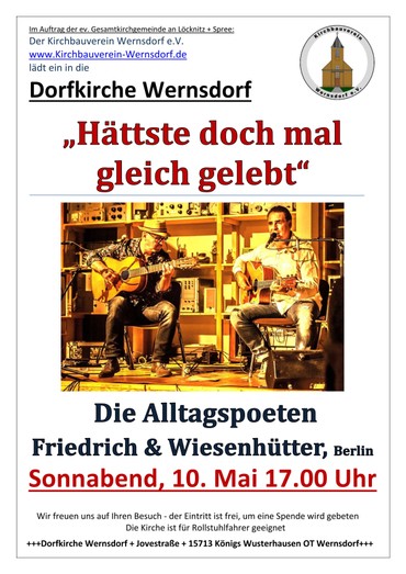 „Friedrich & Wiesenhütter die Alltagspoeten aus Berlin“ kommen am 10.05.2025 um 17.00 Uhr zu uns in die Dorfkirche Wernsdorf.