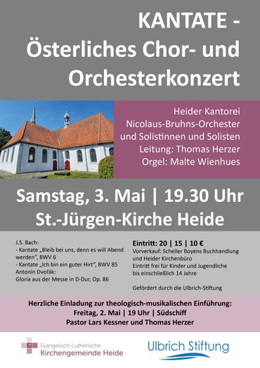 KANTATE – Singt! Unter diesem Titel wird es in der Heider St. Jürgen-Kirche zum ersten Mail seit längerer vakanz- und baustellenbedingter Pause wieder ein Chor- und Orchesterkonzert geben. Am 3. Mai um 19:30 Uhr führt die Heider Kantorei gemeinsam mit dem Nicolaus-Bruhns-Orchester und Solistinnen und Solisten zwei Bach-Kantaten auf: „Bleib bei uns, Herr, denn es will Abend werden“ sowie „Ich bin ein guter Hirt“. Beide Kantaten wurden vor genau 300 Jahren in Leipzig uraufgeführt. Außerdem erklingt das Gloria aus der D-Dur-Messe von Antonín Dvořák. Die musikalische Leitung hat Kantor Thomas Herzer.