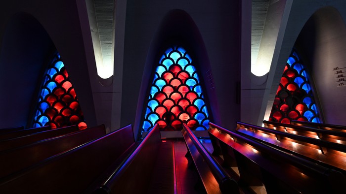 Schon der Weg zur Kirche ist eindrucksvoll: Eine lange Freitreppe führt hinauf zum Eingang, hinter dem sich das 17 Meter hohe Gewölbe öffnet. Unverputzte Wände machen die Konstruktion selbst zum Gestaltungselement. Die besondere Lichtführung verstärkt die Atmosphäre: Während der Altarraum hell erstrahlt, tauchen indirekte Strahler das Kirchenschiff in ein sanftes Halbdunkel – ein Raum, der zur Besinnung einlädt.