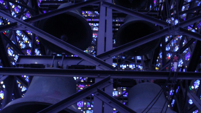 Nach dem Gottesdienst läuten die Glocken der Kaiser-Wilhelm-Gedächtnis-Kirche 15 Minuten lang für den Frieden