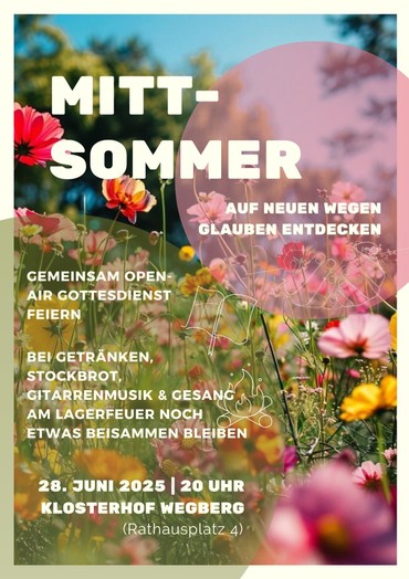 Der Ortsausschuss Pastoral St. Peter und Paul Wegberg lädt herzlich ein zum Mittsommernachtsgottesdienst am Samstag, 28. Juni 2025, um 20:00 Uhr im Klosterhof Wegberg (Rathausplatz) – unter freiem Himmel und in besonderer Atmosphäre.