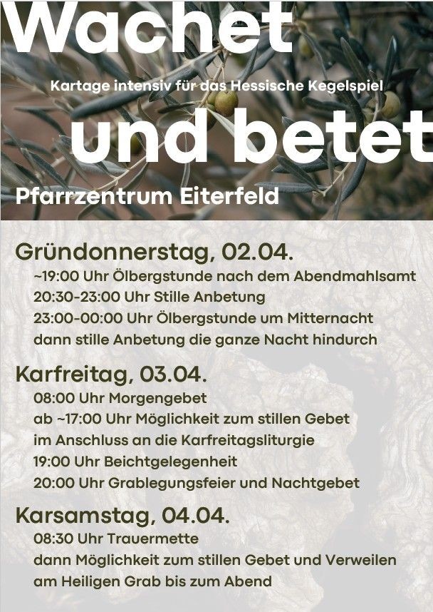 Von Gründonnerstagabend bis zum Karsamstagabend wird es im Pfarrzentrum Eiterfeld verschiedene Möglichkeiten geben, die Kartage geistlich zu vertiefen – mit Ölbergstunden, stiller Anbetung, Nachtwachen, Grablegungsfeier und Trauermette. Hierzu wird ein sogenanntes „Heiliges Grab“ hergerichtet, wo ein jeder eingeladen ist, so lange er oder sie möchte, im Gebet zu verweilen. Weitere Informationen entnehmen Sie den Plakaten und der Gottesdienstordnung. Für die Anbetungsstunden in der Nacht von Gründonnerstag auf Karfreitag werden Beterinnen und Beter gesucht, die Zeiten übernehmen möchten. Entsprechende Listen zum Eintragen sind in der Kirche St. Georg Eiterfeld ausgelegt. Dieses besondere Angebot richtet sich an alle im ganzen Pastoralverbund.